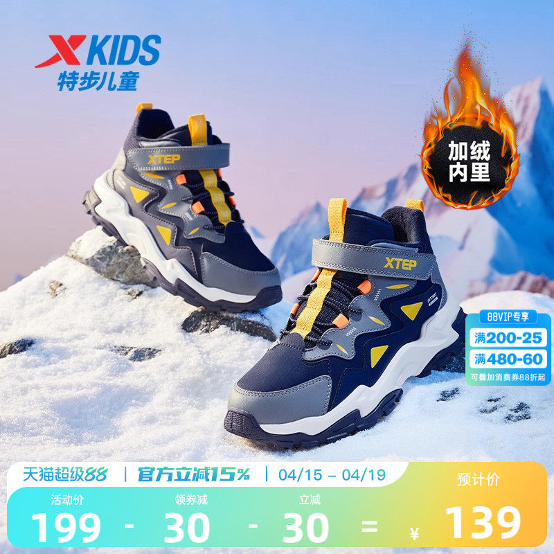 特步男童鞋加绒鞋冬季二棉鞋皮面鞋儿童中大童高帮保暖休闲运动鞋