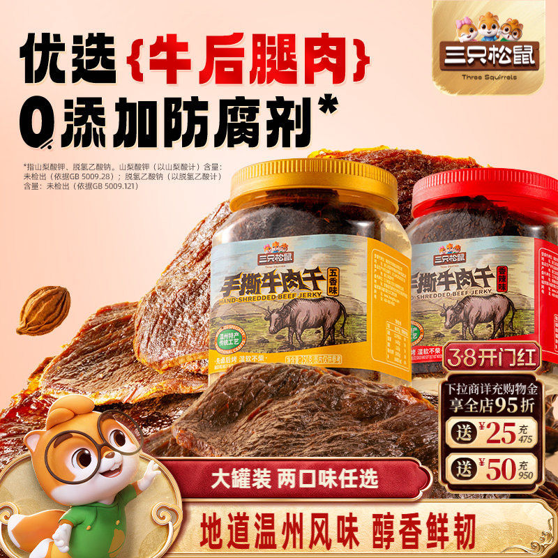 三只松鼠_手撕牛肉干香辣五香原切大片肉脯特产熟食零食罐装小吃