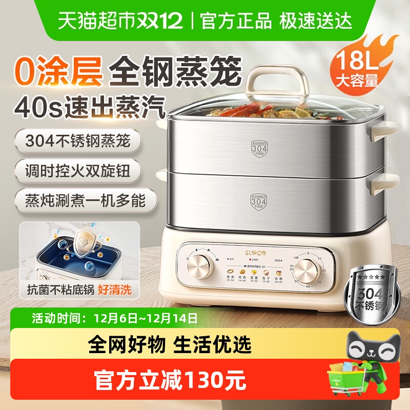 苏泊尔电蒸锅不锈钢家用智能多功能双层大容量蒸煮一体预约蒸汽锅