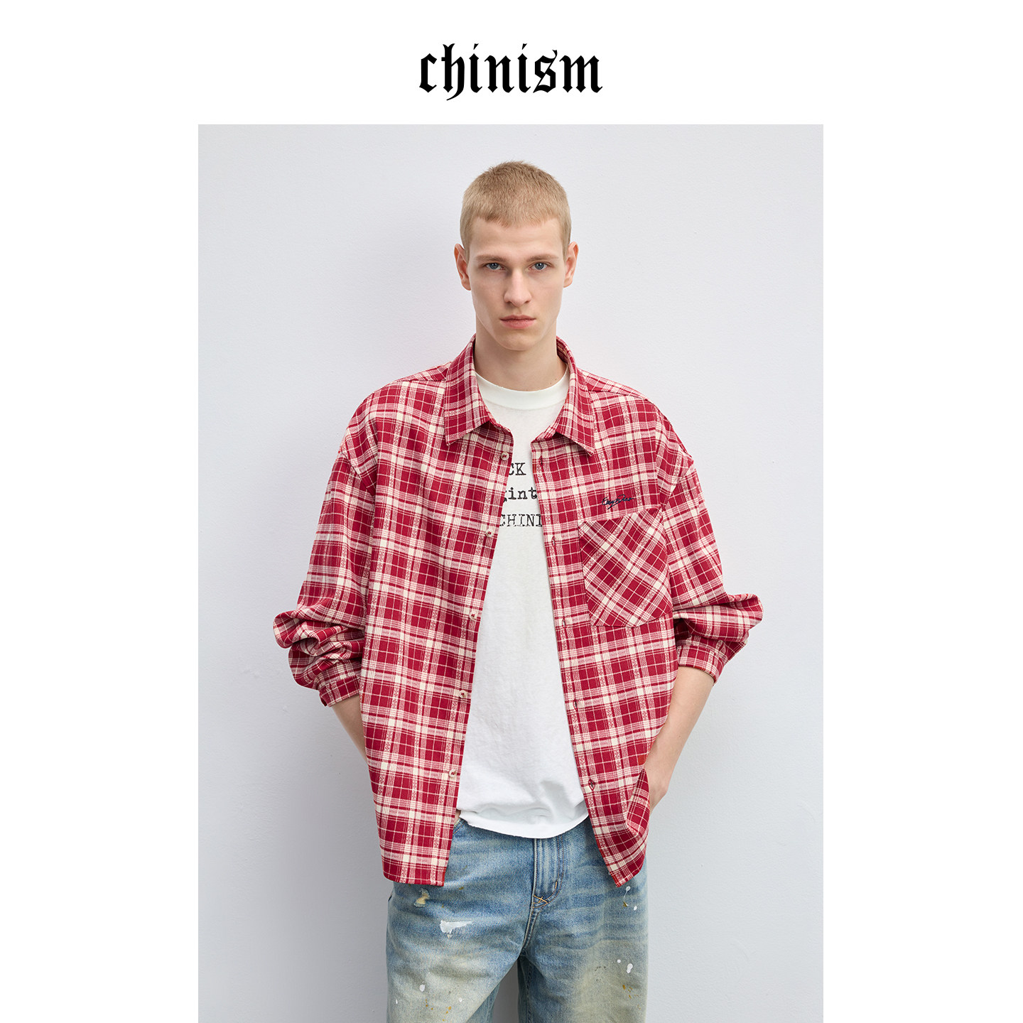 CHINISM丨仿法兰绒格子长袖衬衫男春季宽松内搭衬衣男士外套