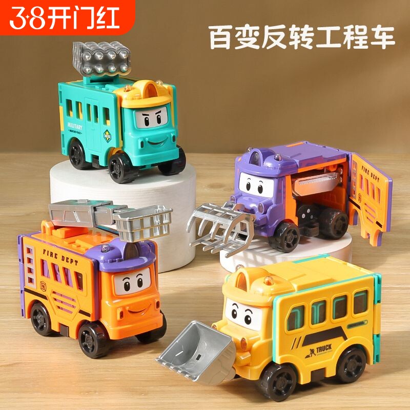 百变校巴反转变形车玩具车儿童回力工程车小男孩宝宝生日礼物小车
