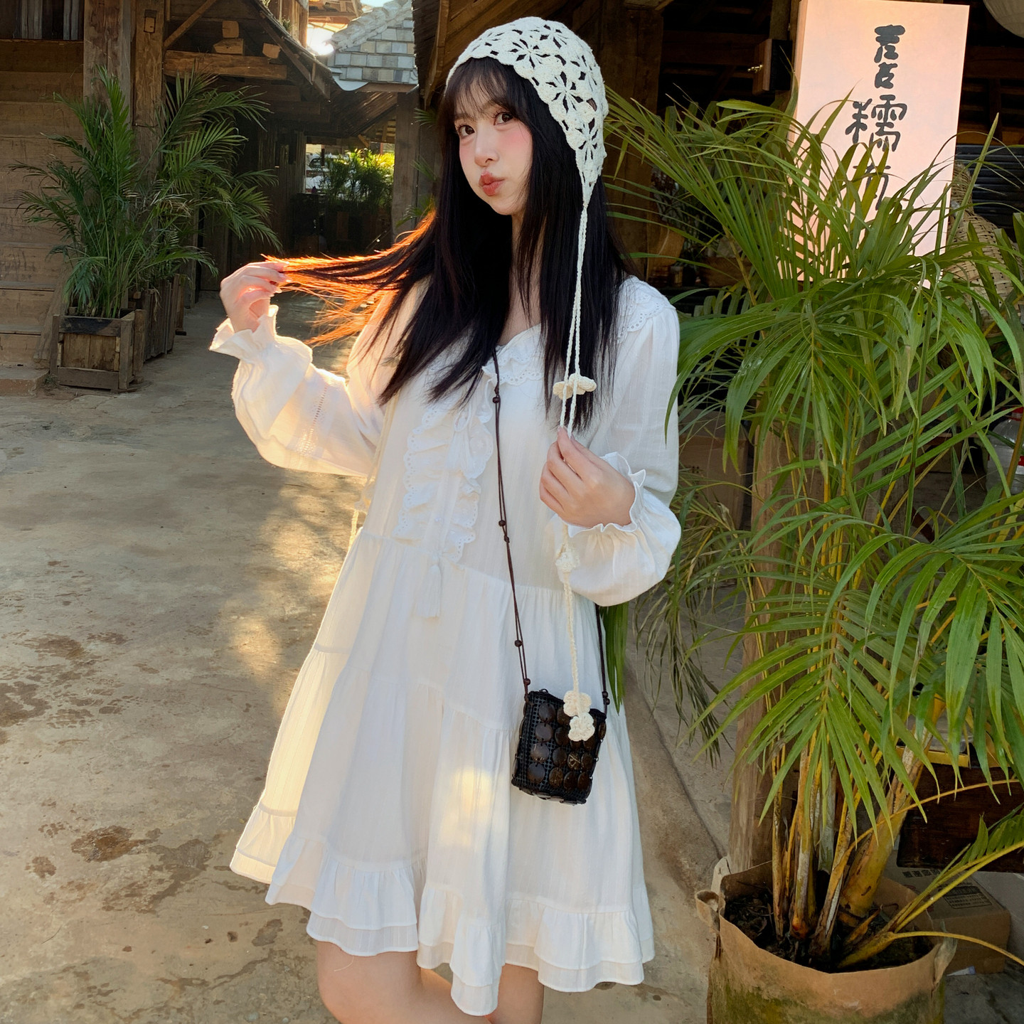 森女系原创想去海边公主演奏会温柔甜美生日裙长袖白色蕾丝连衣裙