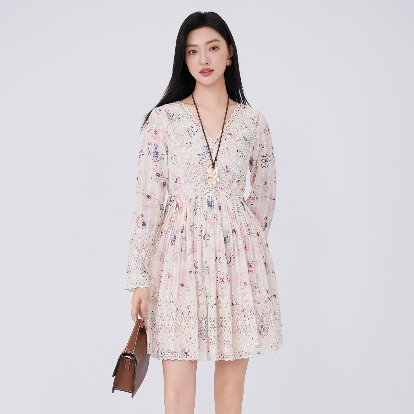 芭依璐2026春季新款长袖连衣裙法式甜美蕾丝V领重工印花小众裙子