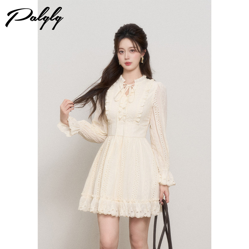 法式木耳边镂空蕾丝v领长袖连衣裙女秋季高级感甜美初恋小洋裙子