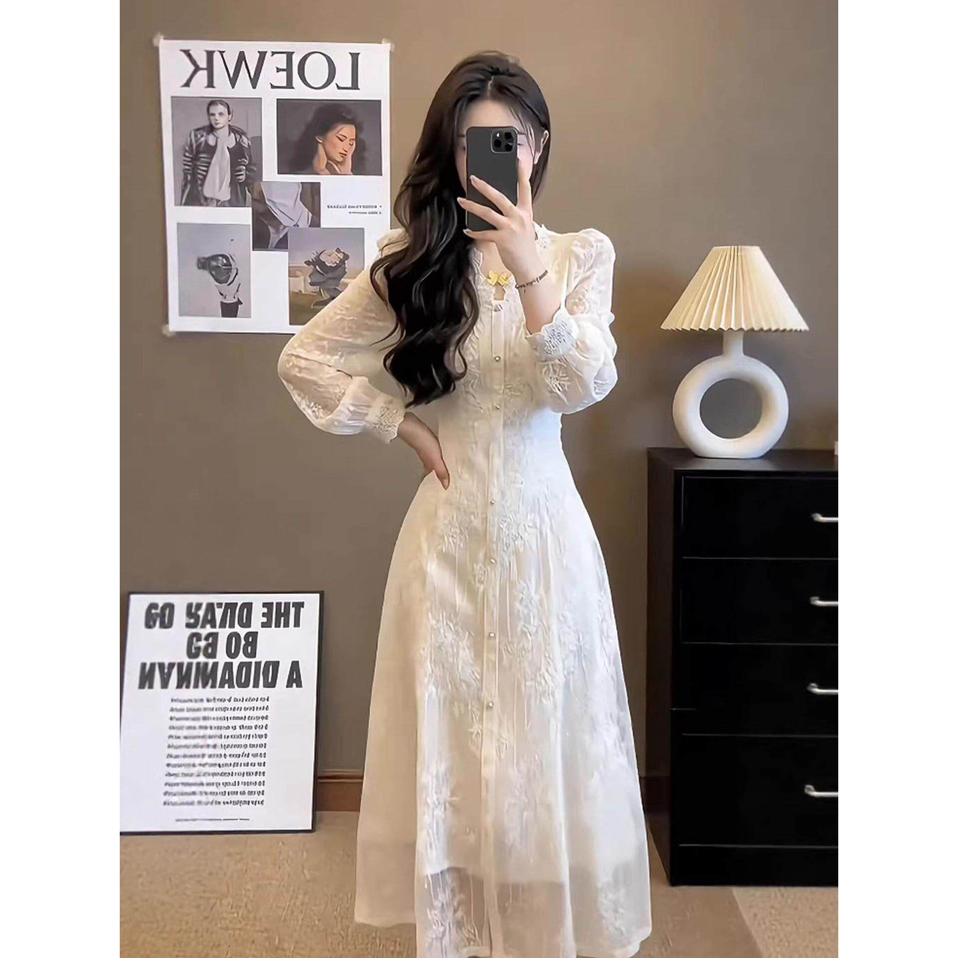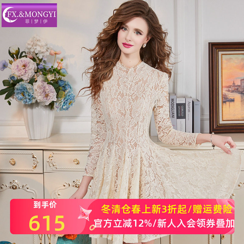 菲梦伊白色蕾丝连衣裙女长袖春装淑女名媛甜美修身设计感气质裙子
