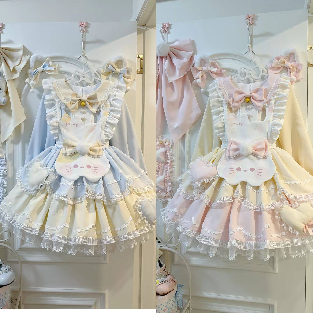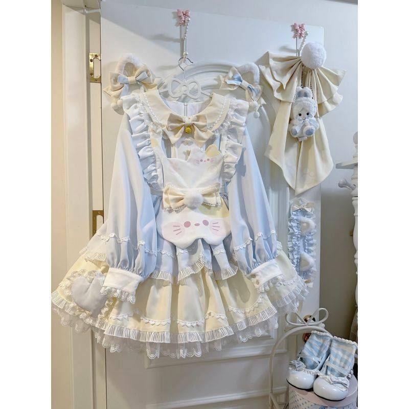 甜美可爱长袖Lolita洛丽塔蕾丝蓬蓬连衣裙蝴蝶结小猫围裙两件套女
