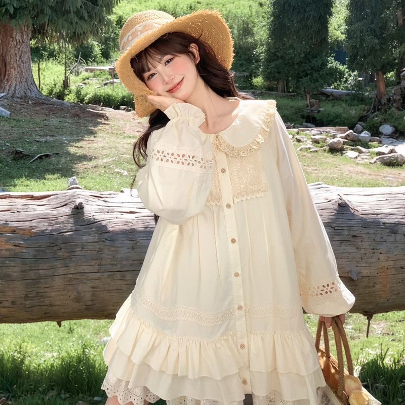 独角概念澳洲 2025春夏新款甜美风叠层蕾丝花边长袖衬衫连衣裙