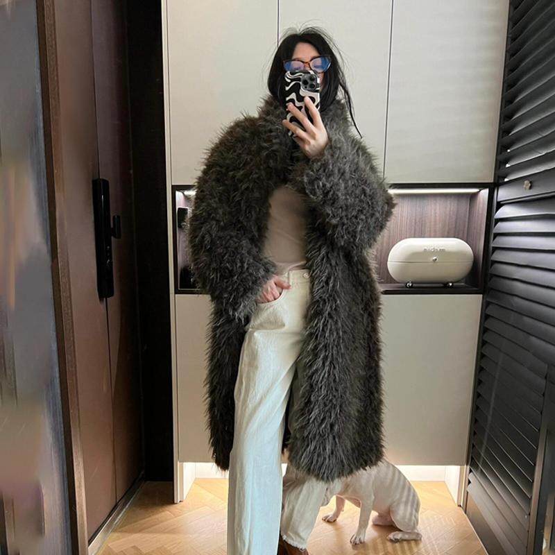 皮毛一体棕色羊羔毛外套女2025新款时尚海宁长款环保皮草大衣冬厚