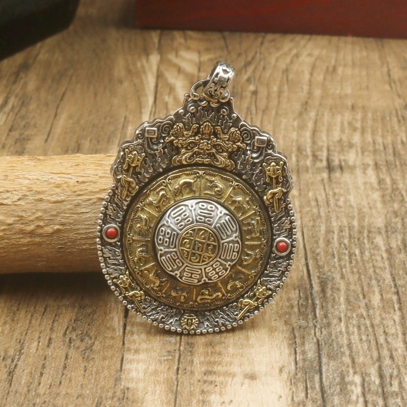 S925银镶嵌紫铜可转动莲师文殊九宫八卦牌财项链吊坠本命年男女