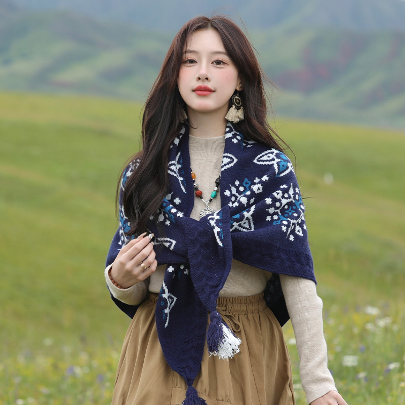 藏青雪花民族风披肩女外搭春秋款旅游云南西藏斗篷丝巾围巾围脖潮
