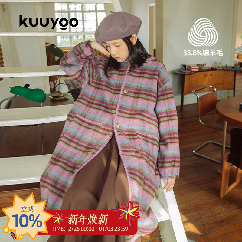 KUUYOO复古彩色格纹茧型毛呢大衣冬季女童氛围感粉色儿童毛呢外套