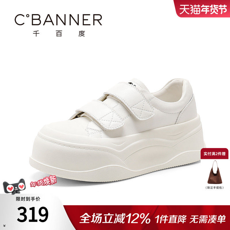 千百度小白鞋女新款真皮增高松糕休闲百搭纯色魔术贴女鞋厚底板鞋