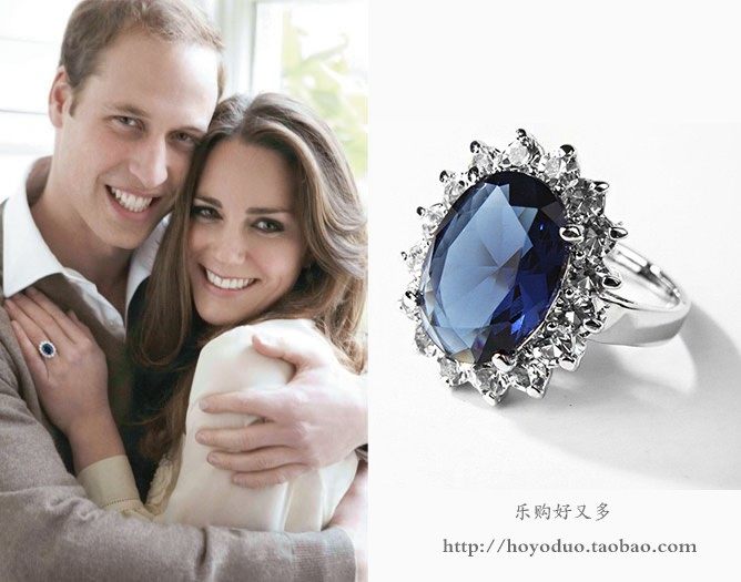 欧美高贵镶嵌蓝宝石水晶凯特王妃订婚戒指韩版复古微镶钻锆石指环