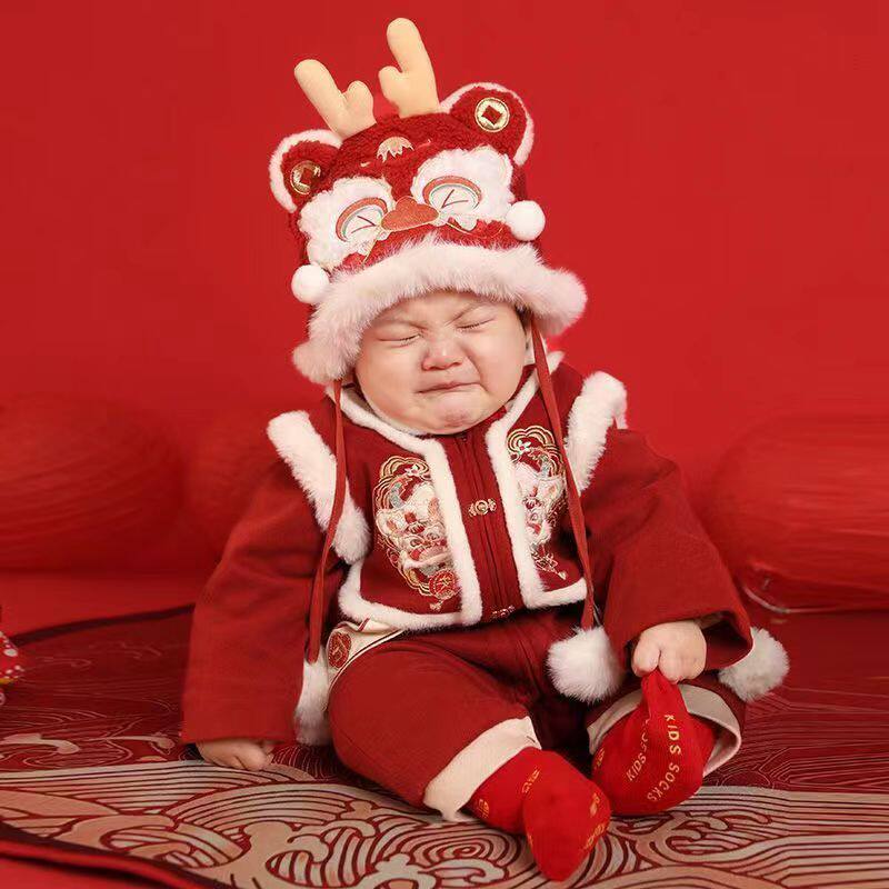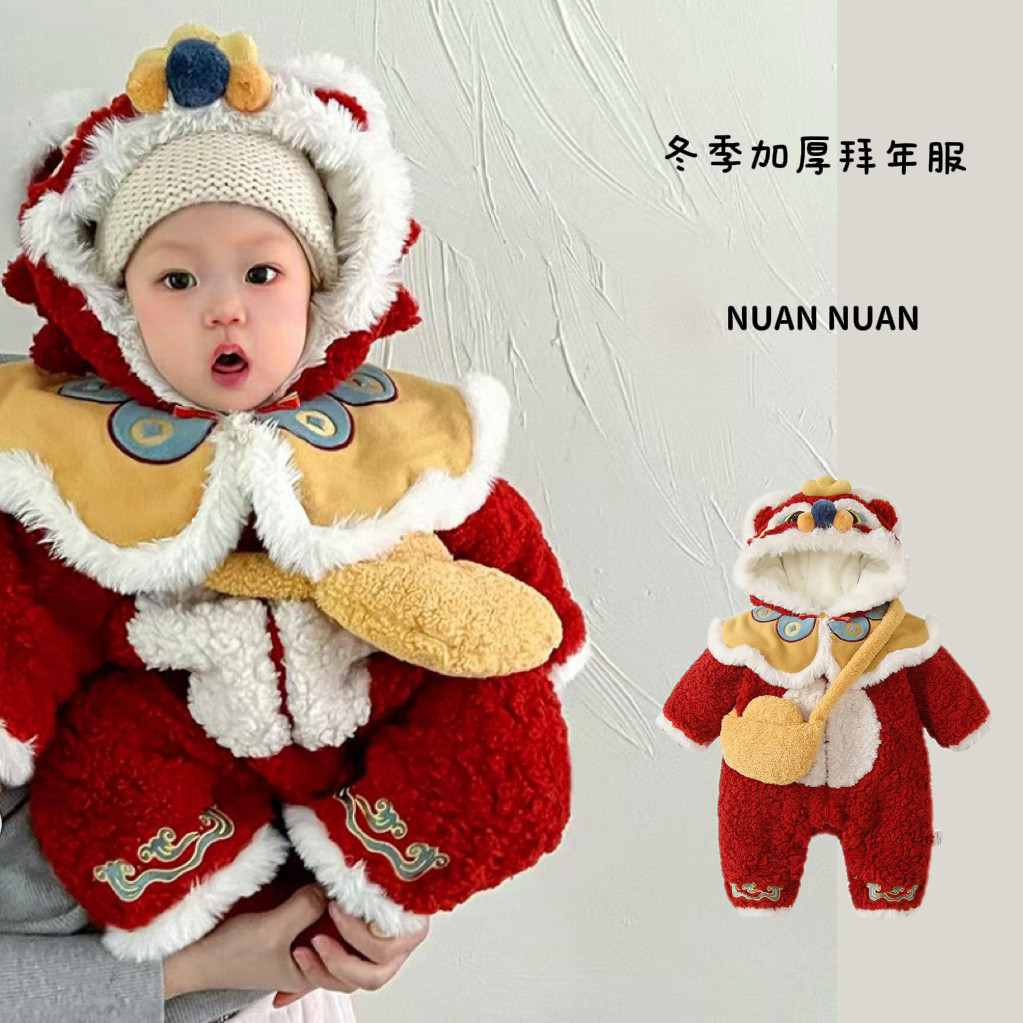 婴儿冬季加厚连体衣龙宝宝百天满月礼服婴儿国风拜年服可爱毛绒衣