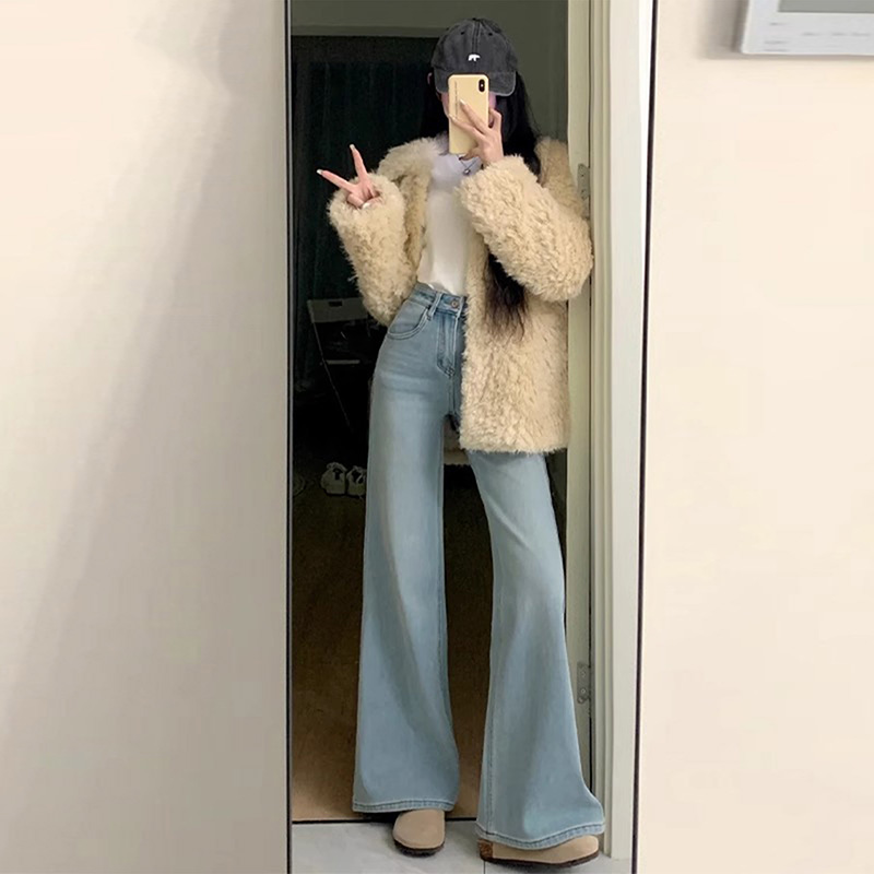 浅蓝色高腰不贴腿微喇牛仔裤女2025冬季加绒显瘦百搭拖地喇叭长裤