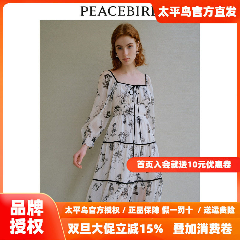 太平鸟 2025年秋季法式撞色系带连衣裙长袖印花蛋糕裙女奥莱