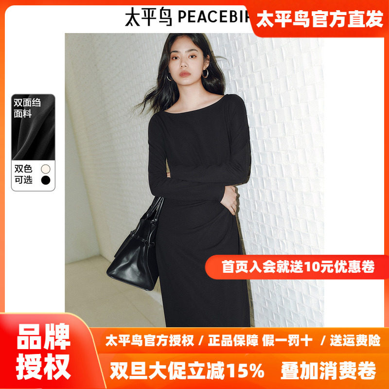 太平鸟长袖船领收腰褶皱连衣裙女2025秋新款中长款修身赫本风法式