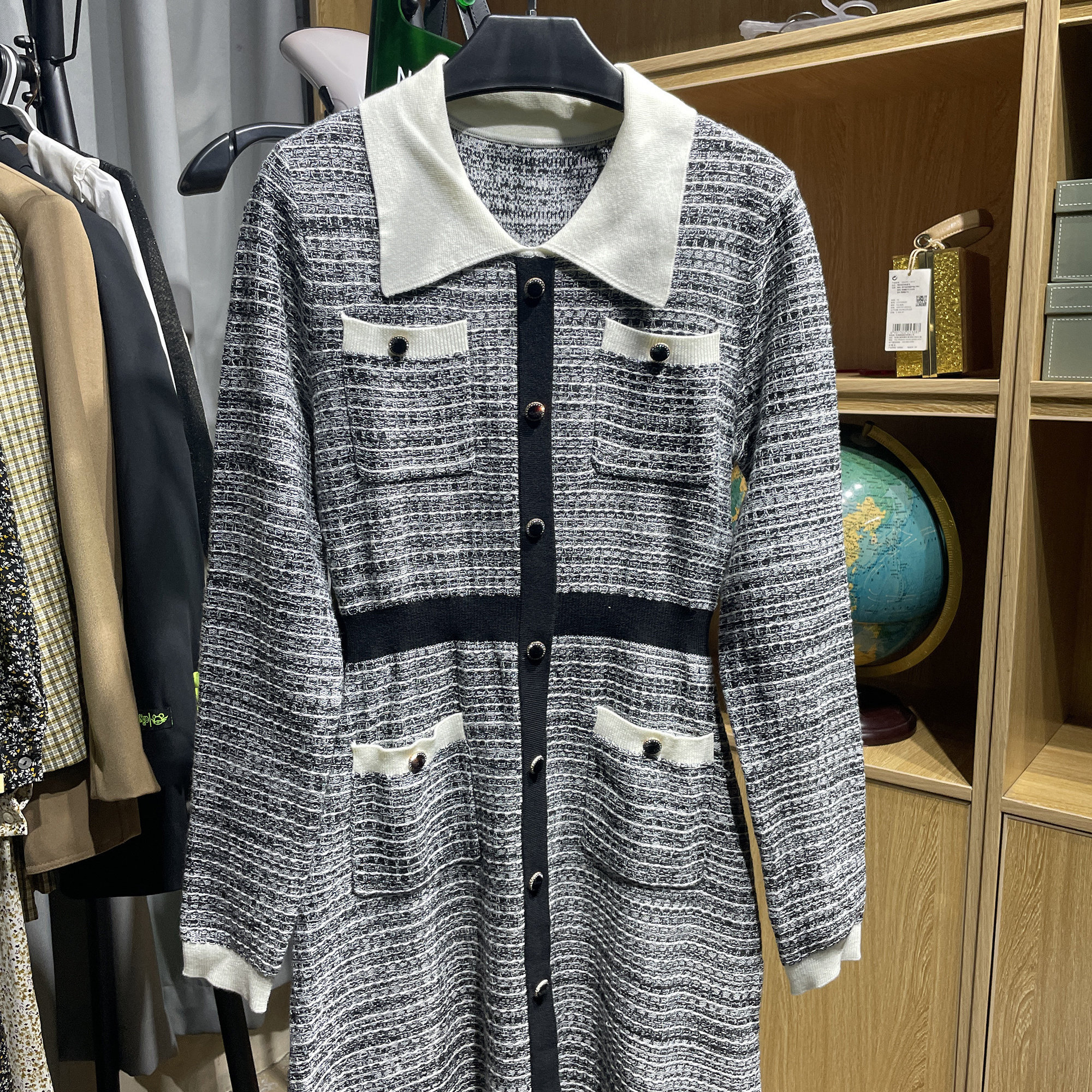 AD秋冬名媛小香风轻奢拼色西装连衣裙长袖小翻领伞裙假两件套裙女