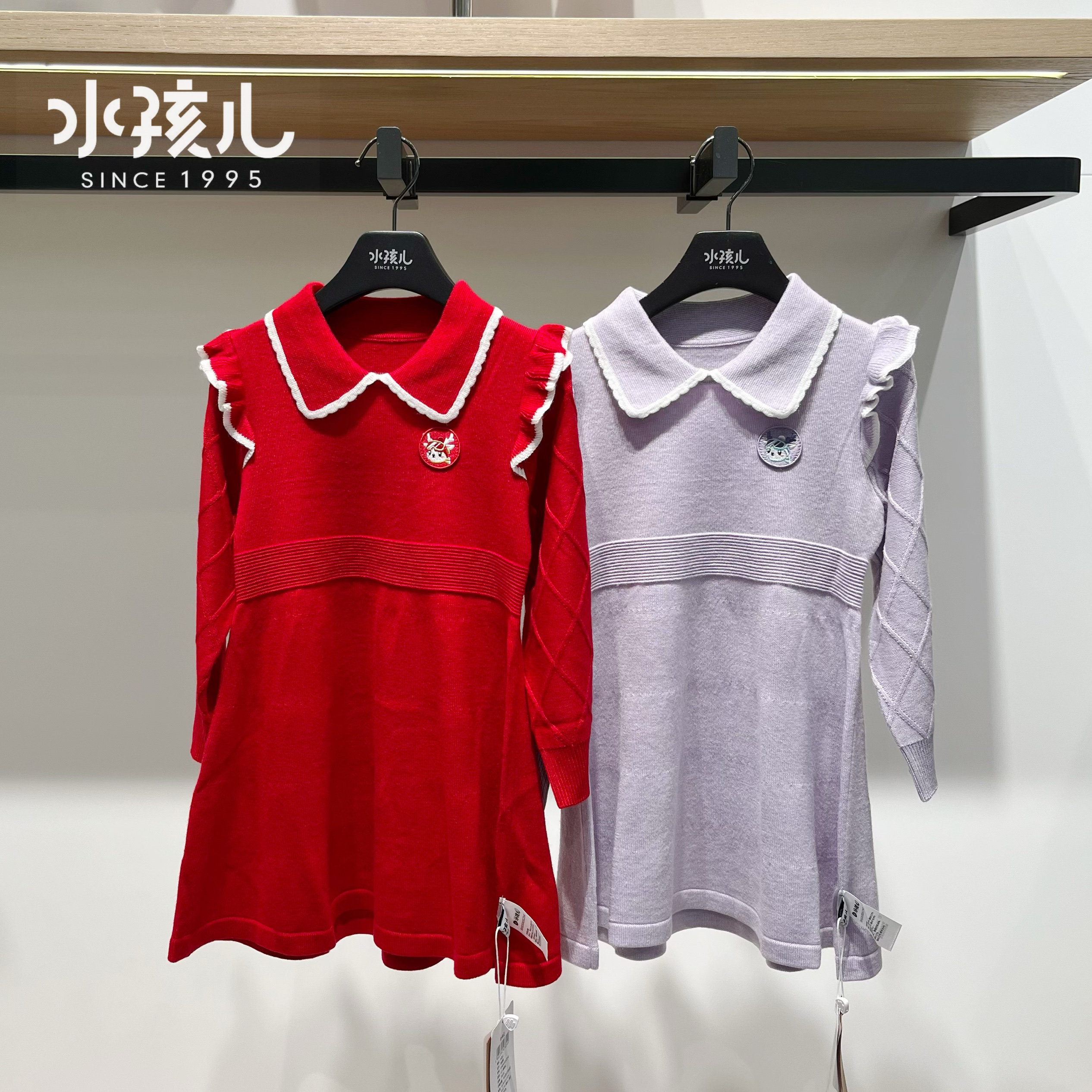 正品水孩儿童装女童2024冬季新款线织连衣裙甜美针织长袖舒适裙子