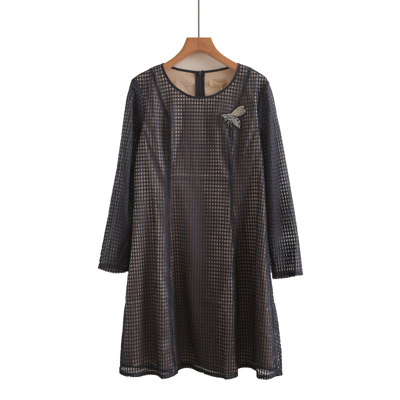 专柜669元【S】高端品牌女时尚贴布绣花格纹网纱双层长袖连衣裙