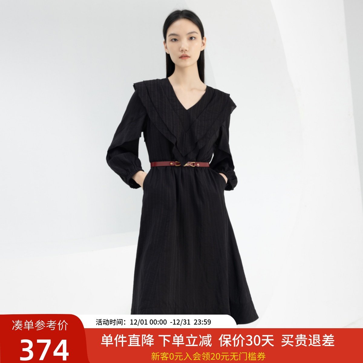 xg雪歌专柜正品设计感双V领黑色长袖连衣裙中长款XJ104024A190