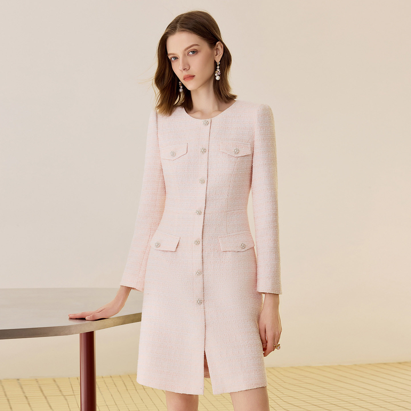 粉色小香风连衣裙粗花呢女2025新款秋冬季高级感气质长袖优雅礼服