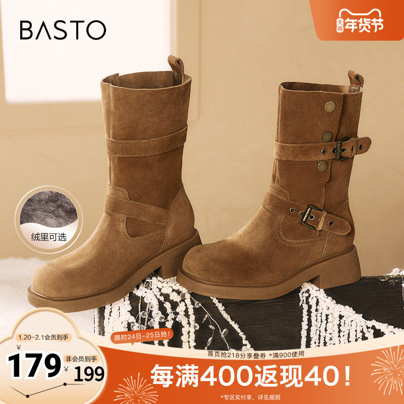 百思图冬季新款西部牛仔靴粗跟复古圆头废土风时装靴BP310DZ4