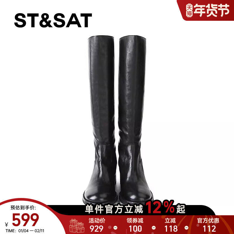星期六加绒英伦长筒靴女2025秋冬粗跟圆头显瘦高不过膝全牛皮长靴