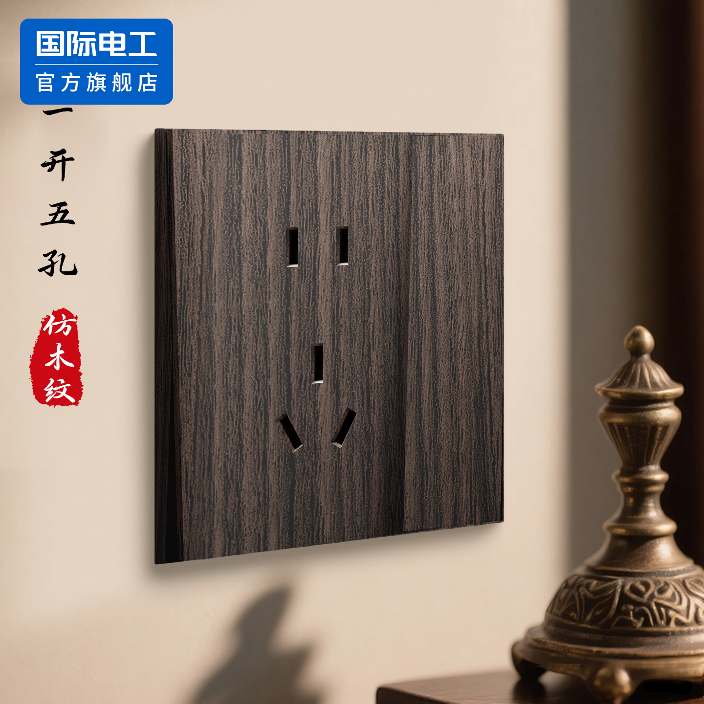国际电工胡桃木纹明装超薄复古开关面板插座墙壁86型明线盒一开五