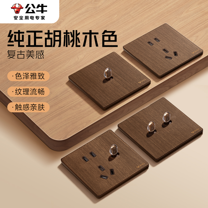 公牛开关插座中古风五孔民宿胡桃原木纹风G27地毯棕复古开关面板