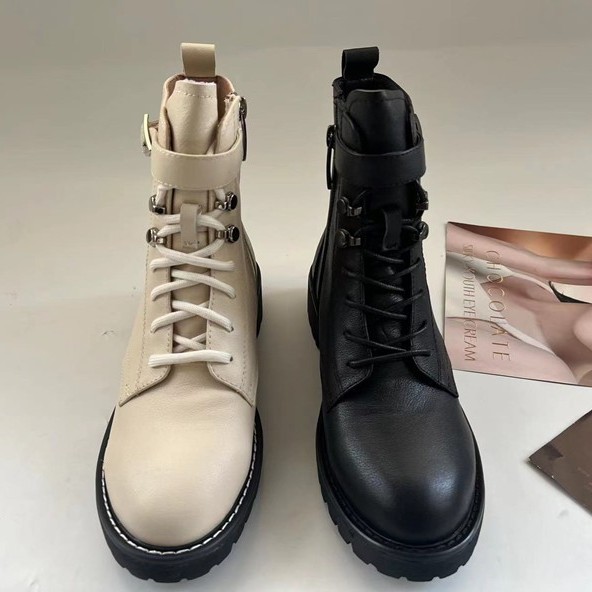 思卡琪马丁靴潮女短靴头层牛皮英伦风前系带中跟粗跟新款大码女鞋