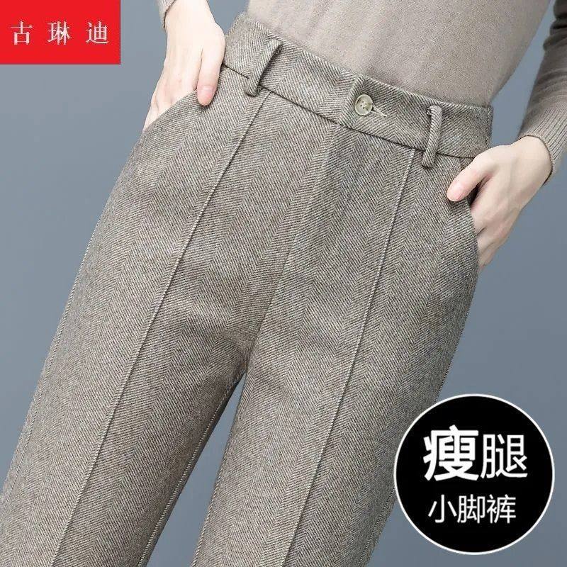 毛呢裤子哈伦裤秋冬款厚款人字纹烟管裤洋气直筒加绒加厚高腰显瘦