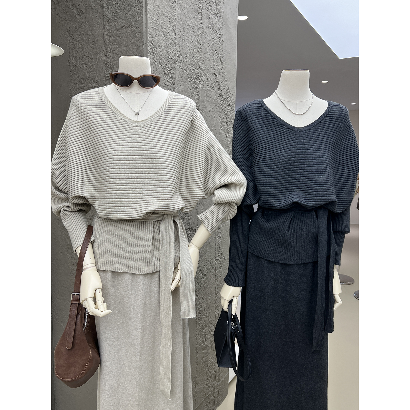 许妍套裙~韩系氛围气质温柔V领毛衣+长款半身裙针织两件套配飘带