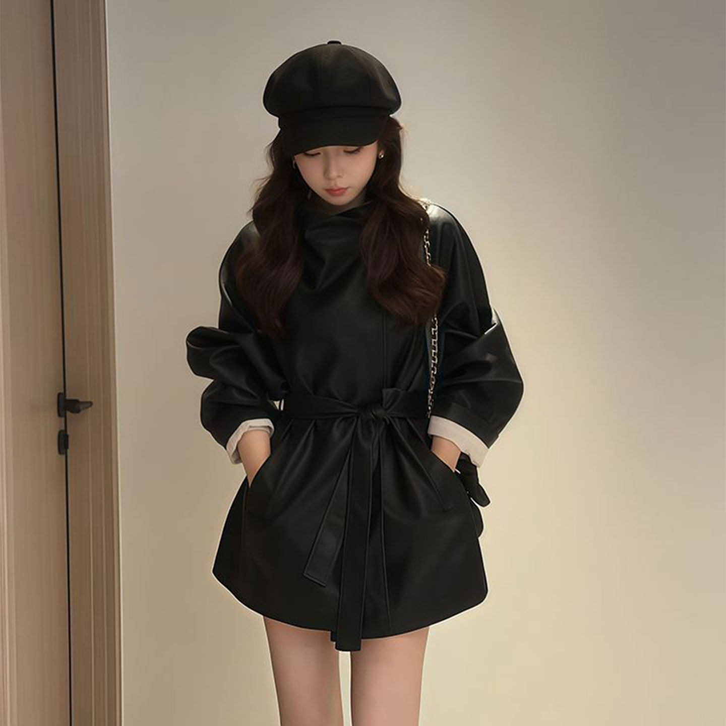 SoulSense长袖立领女风衣春秋连帽插肩袖复古欧美风翻领修身皮衣