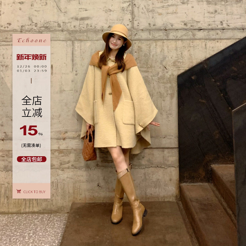 Echoone 亮肤系 圈圈毛斗篷大衣女精致气质松弛感双口袋毛呢外套