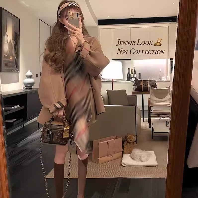 NSS斗篷大衣女 2025秋装双面羊毛咖色格子外套宽松浴袍围脖学院风