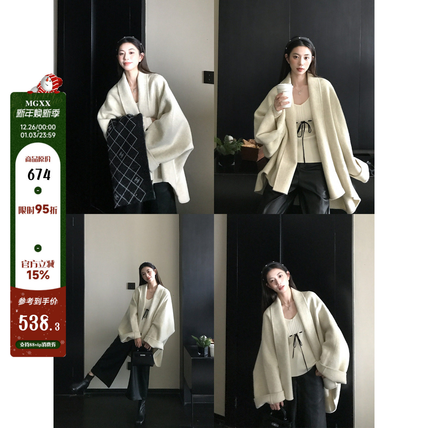 MG小象 小众腔调'100绵羊毛翻领斗篷大衣女秋冬气质廓形毛呢外套