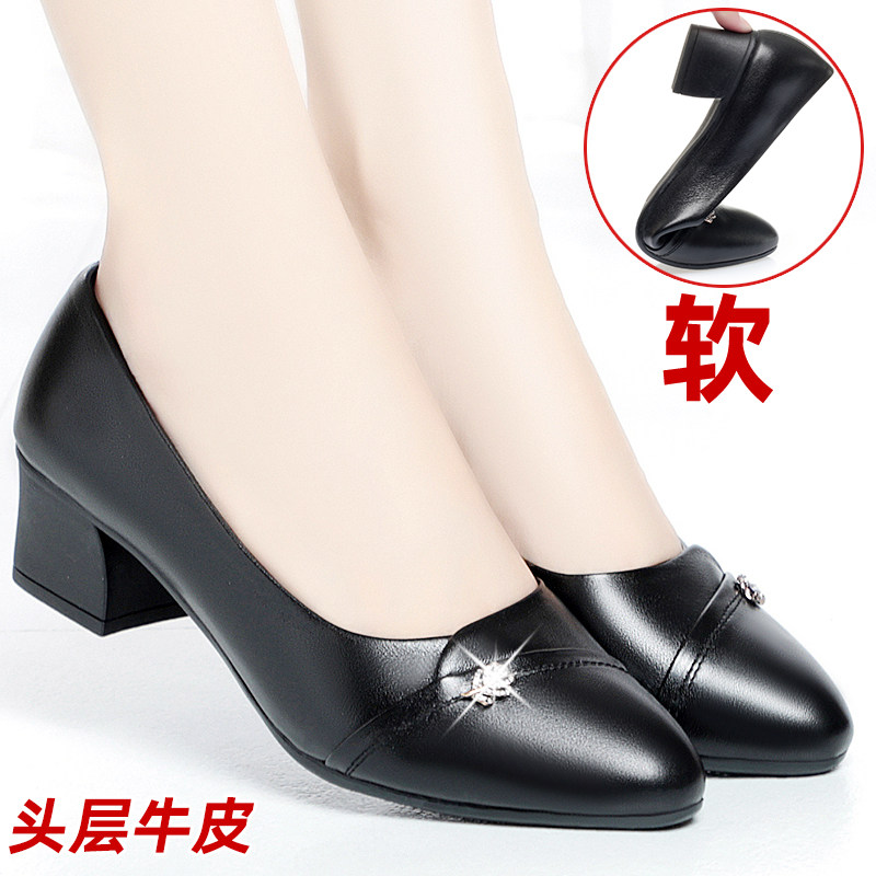 低跟妈妈鞋单鞋女真皮细跟皮鞋女鞋中跟春秋新款黑色职业工作鞋女