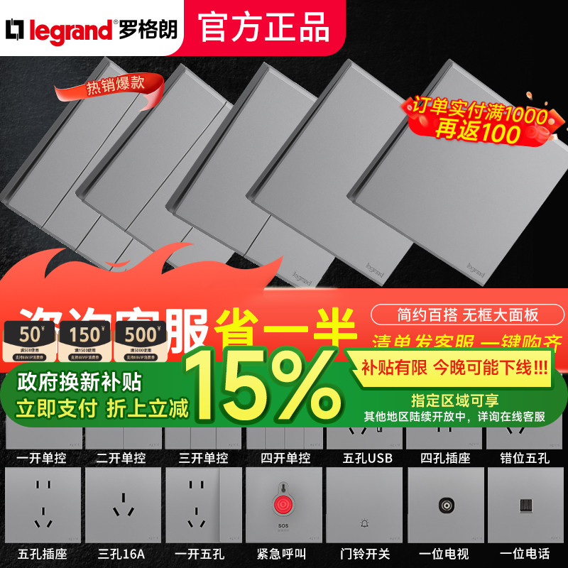 罗格朗开关插座面板画采银色一开单控灯按钮床头五孔86家用遮丑盖