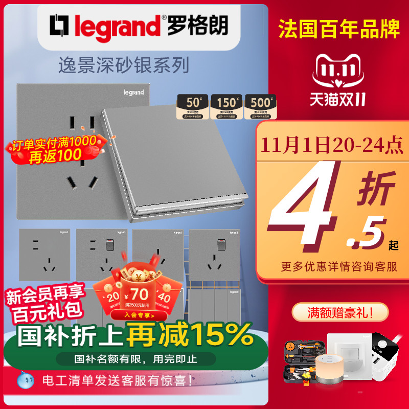 罗格朗开关面板官方逸景银灰色五孔双控一体带usb空调16a床头墙壁