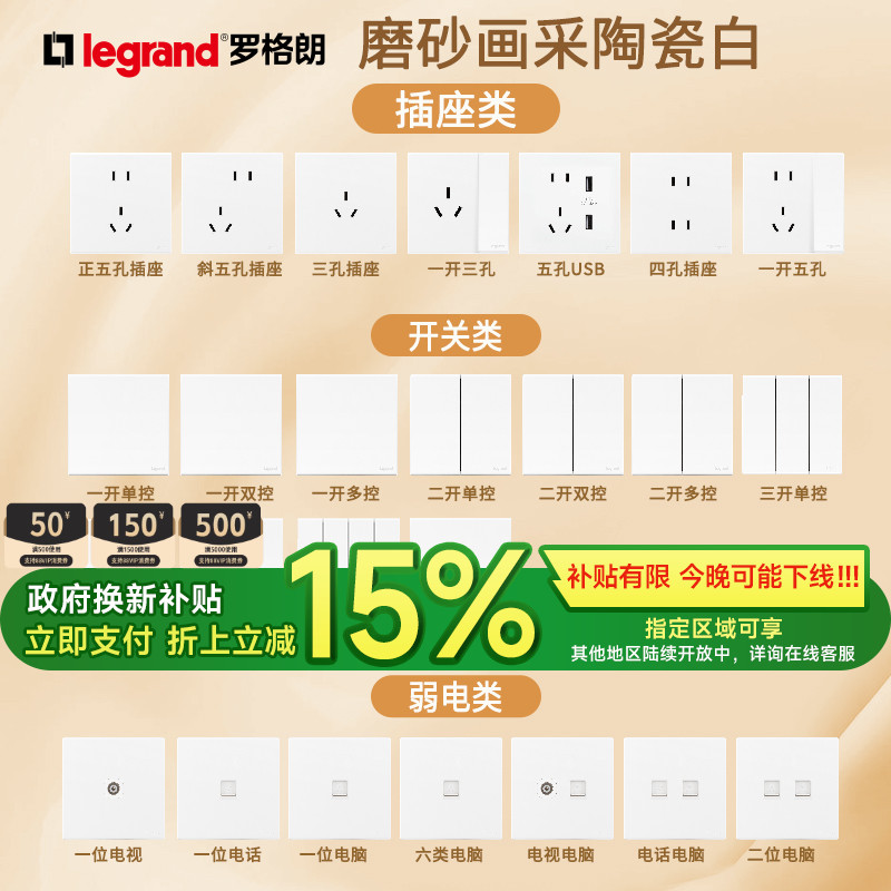 罗格朗开关插座面板画采陶瓷白家用哑光一开五孔暗装三孔16A墙插