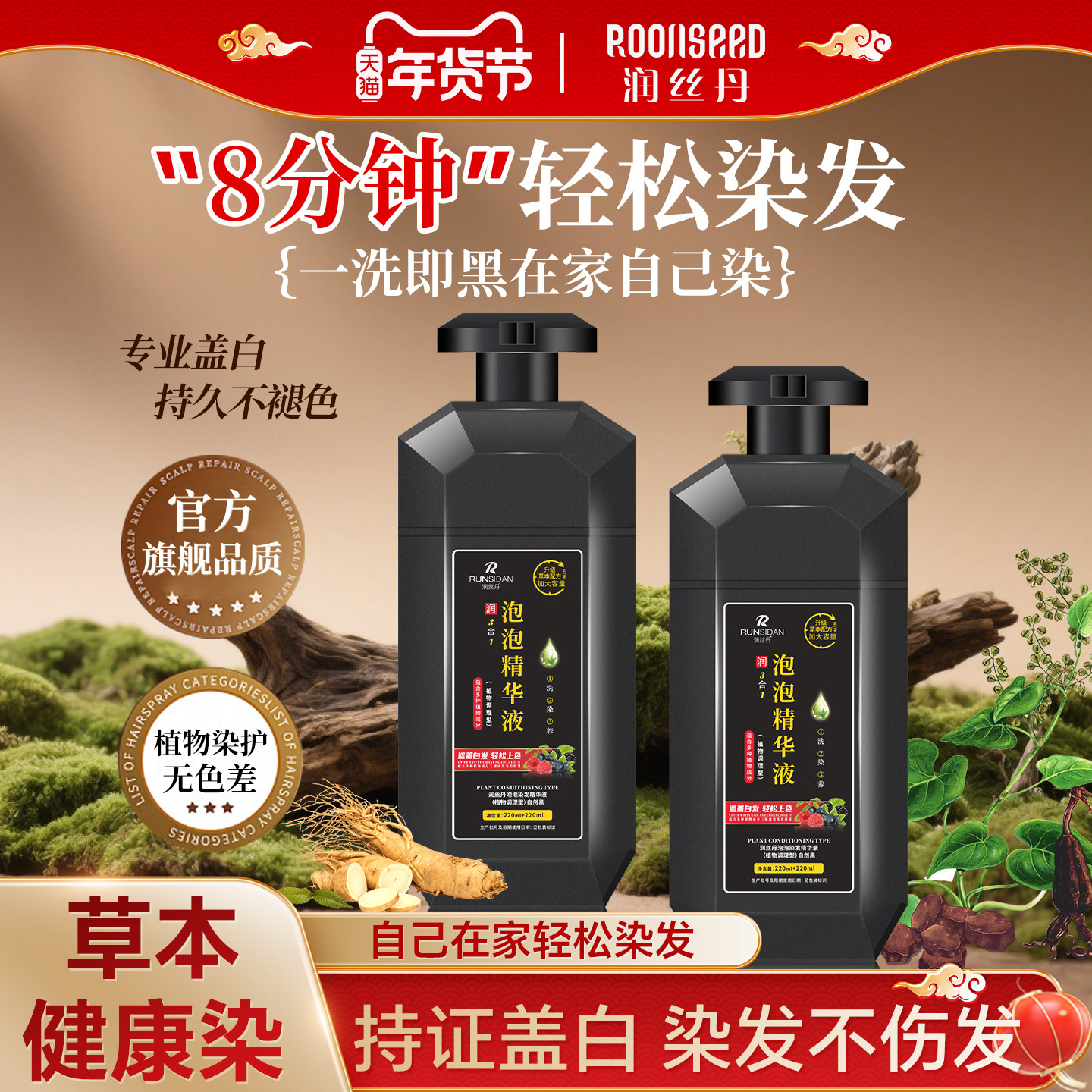 润丝丹一支黑染发剂植物洗发水纯自然黑色染发膏网红遮白发遮白发