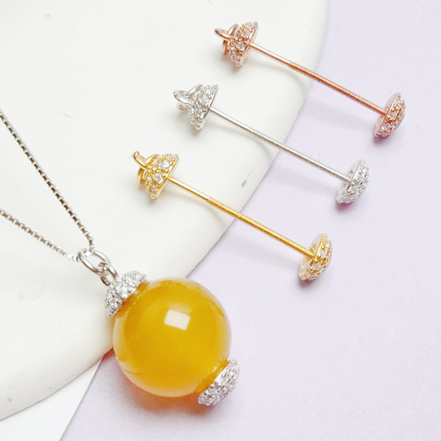 s925纯银圆珠扣半孔吊坠扣DIY蜜蜡玉石琥珀银饰活口空托珍珠粘扣