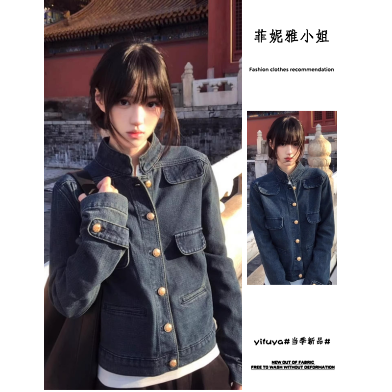 美式复古正肩立领开衫牛仔外套女春秋修身显瘦高级感慵懒风短夹克