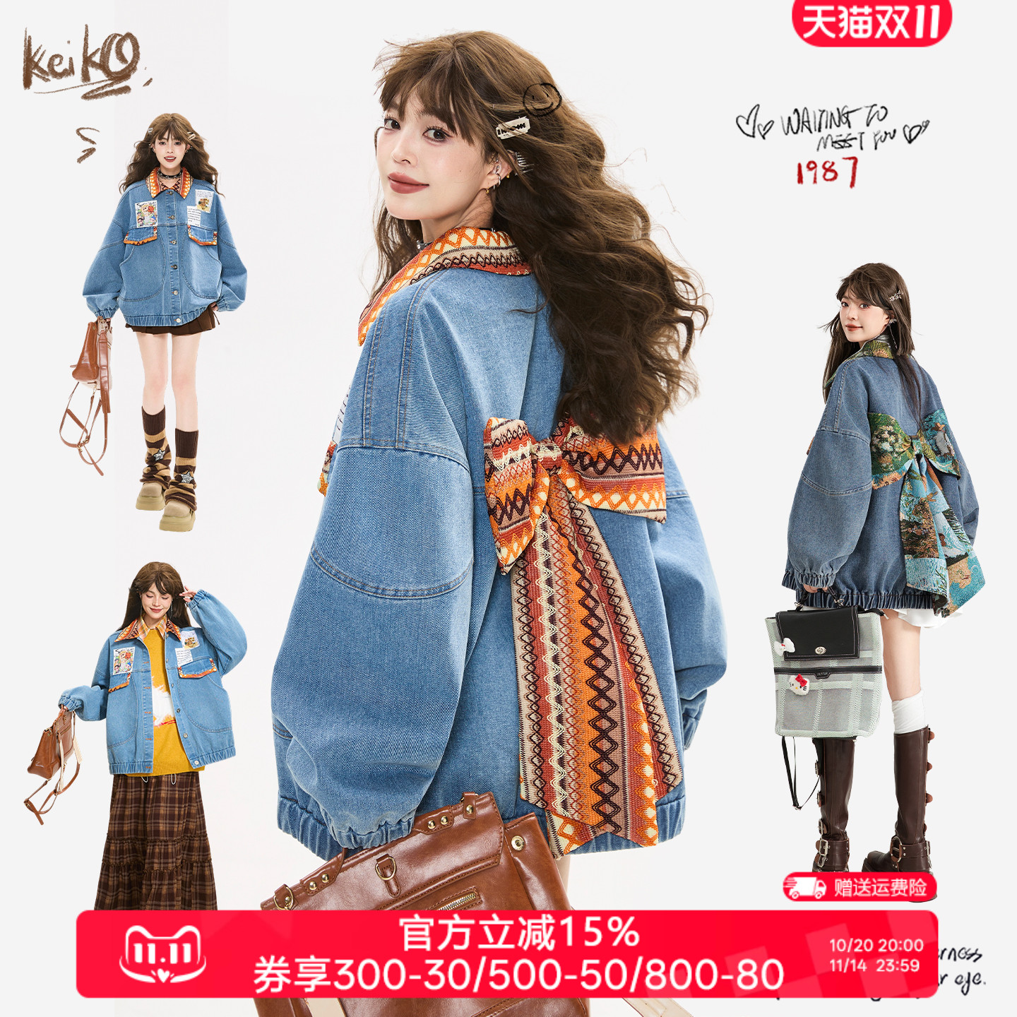 KEIKO 少年感织花蝴蝶结饰牛仔外套秋冬新款巨好看的廓形棉服夹克