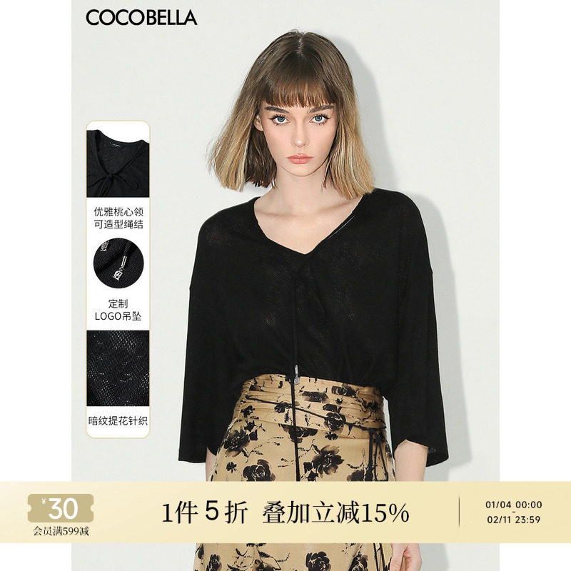 COCOBELLA镂空提花V领系带五分袖针织衫女松弛感黑色T恤TS3002