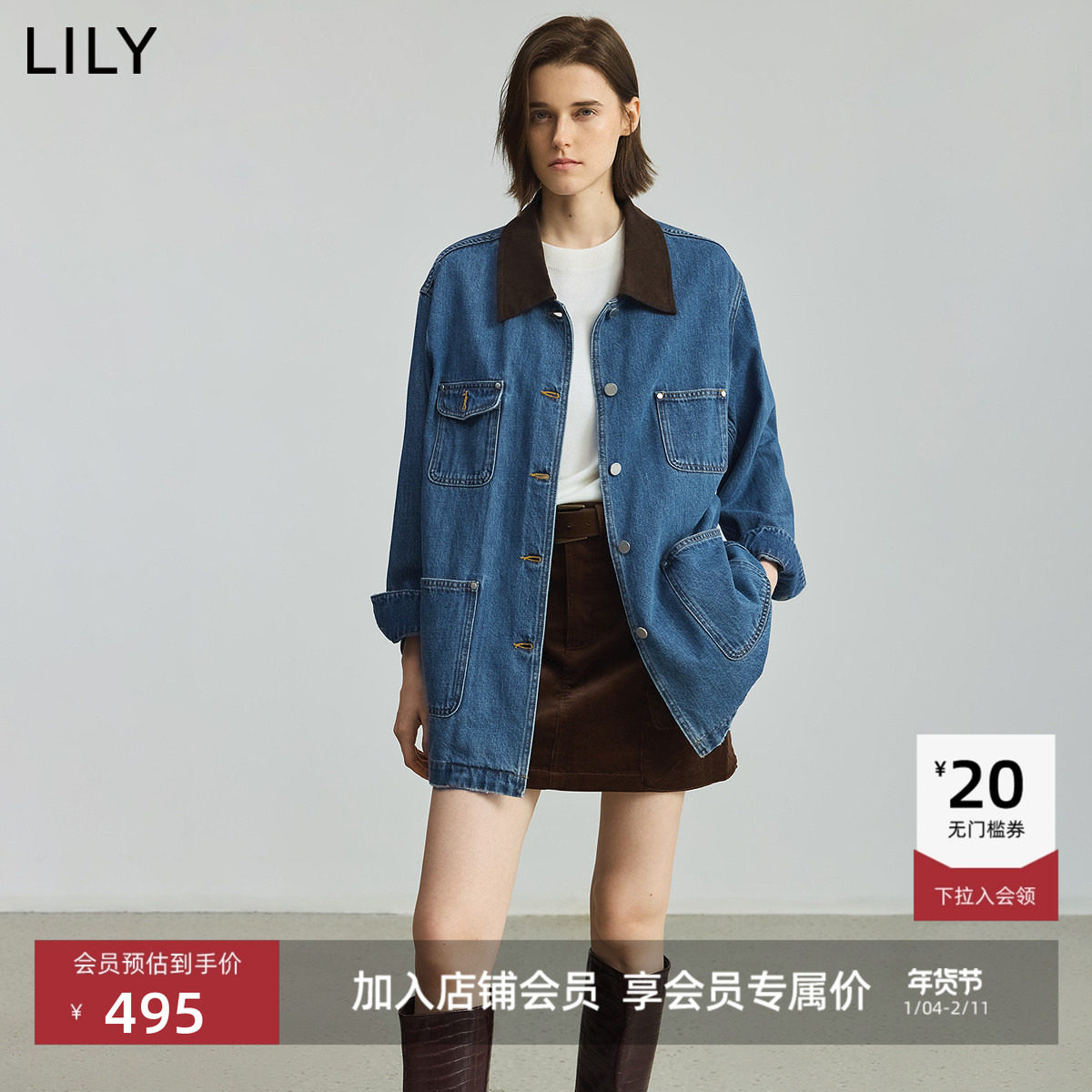 LILY2025新款纯棉复古工装翻领休闲通勤深色牛仔长袖夹克外套女