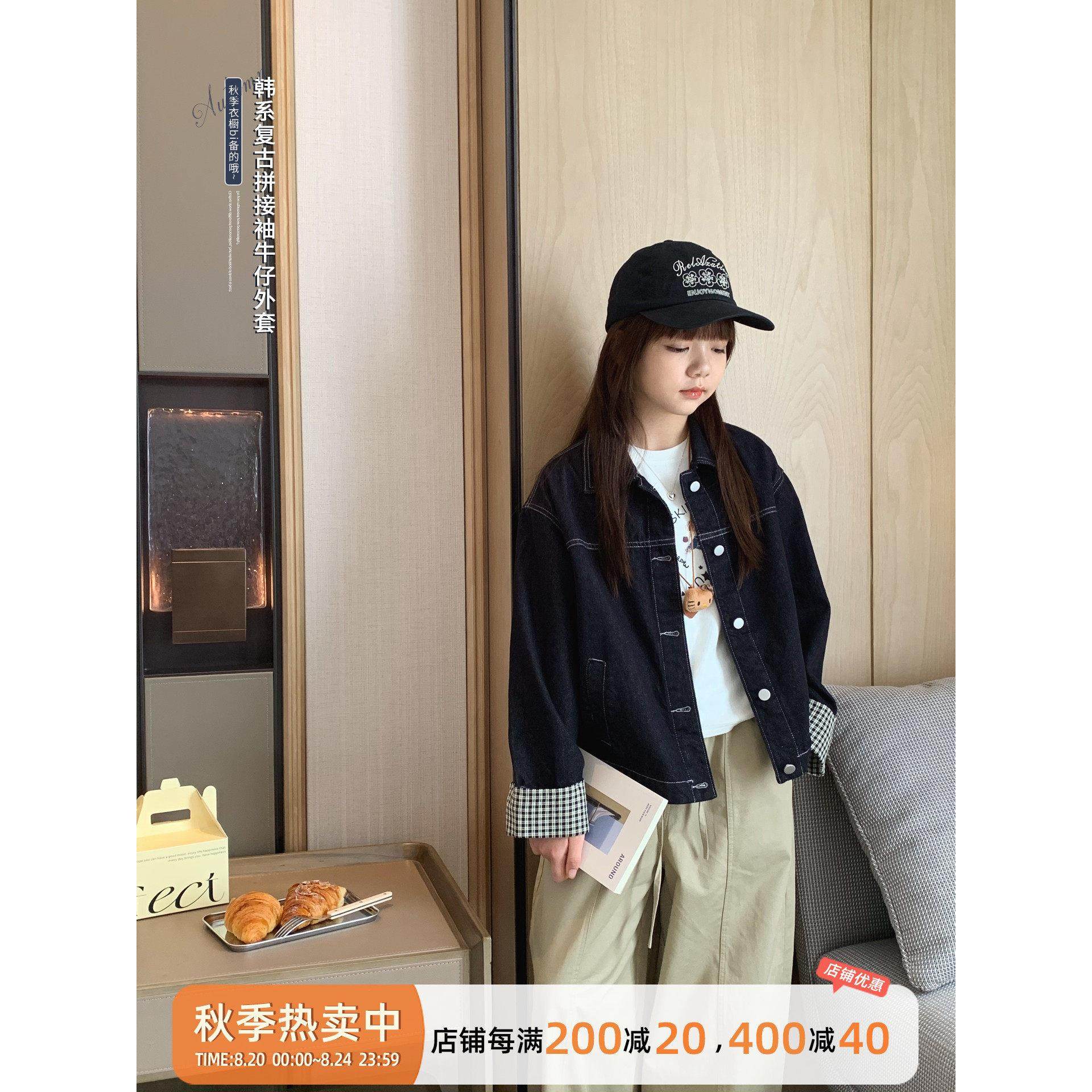 女大童深色牛仔衣2025秋装新款青少年韩版休闲格子袖亲子夹克外套