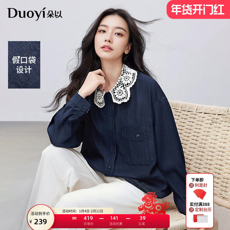 朵以2025秋季新款复古甜美文艺蕾丝娃娃领深色牛仔外套小个子女