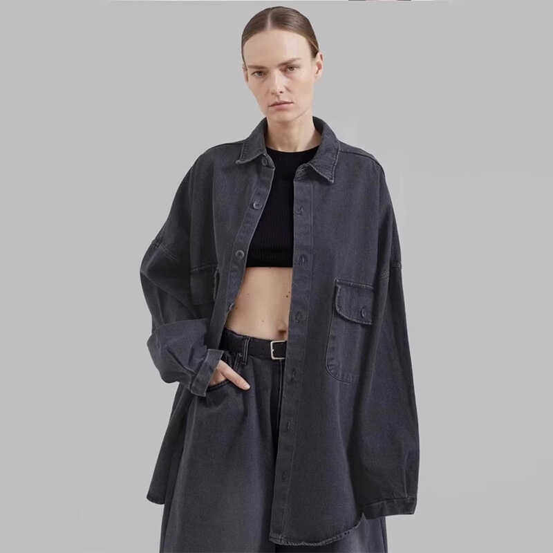 极简风深色牛仔衬衫女2025秋季新款夹克式超大廓形小众上衣外套女